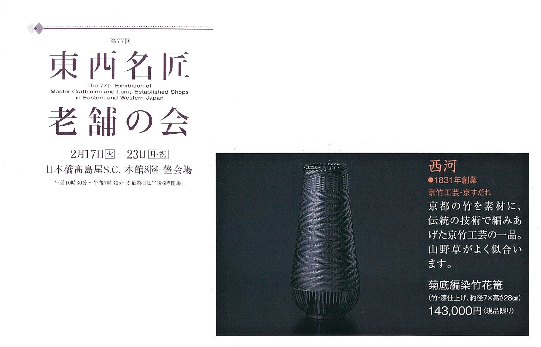 西河はご案内の新作他多くの京竹工芸を出品を出品させていただきます。